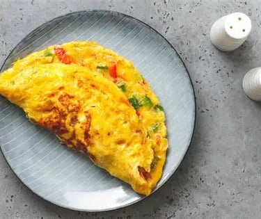 Instructions: Chop ½ bell pepper and ½ onion. Crack and whisk 4 eggs, along with the bell peppers and onions, in a bowl. Add the egg mixture to the pan, cook until set, fold, and serve.