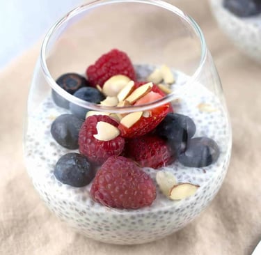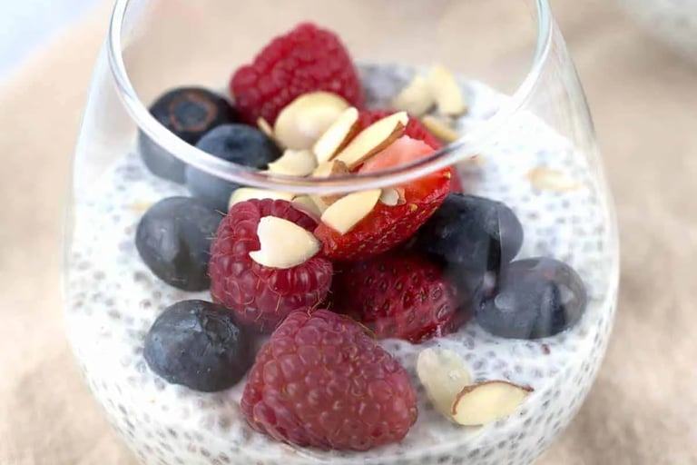Instructions: Mix chia seeds and whole milk in a glass or jar and stir well. Cover and refrigerate for at least 5 hours or overnight until it thickens. Top with mixed berries and almonds before serving.