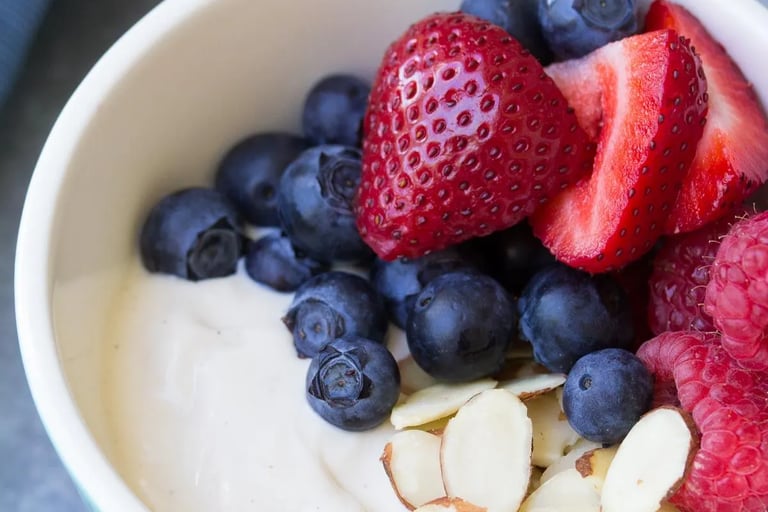 Ingredients: 1 cup Greek yoghurt (full-fat), 1/2 cup mixed berries, 10 almonds